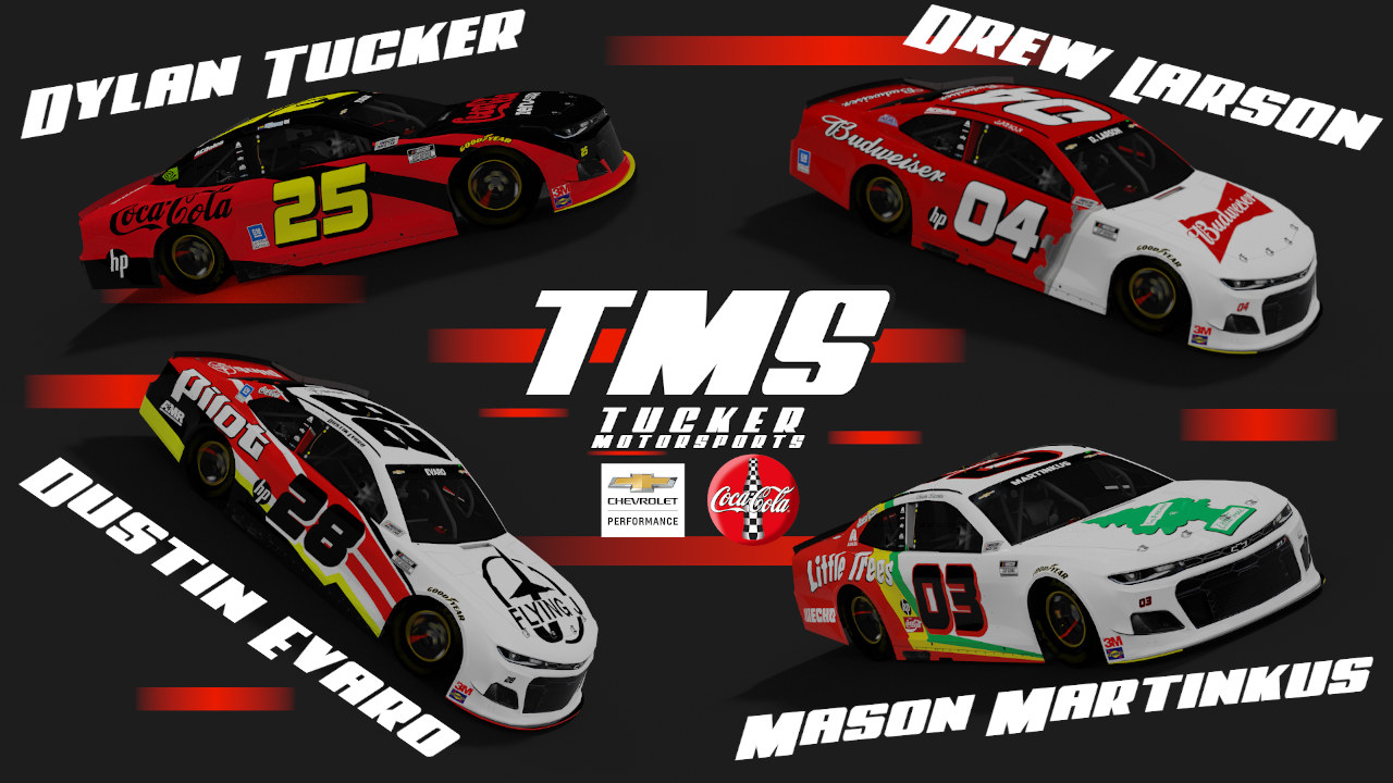 Tucker Motorsports and its 4 drivers have made their way to the final year of the Generation 6 NASCAR Cup Series car. 64 custom cars (w/ pit crews) including primaries, secondaries, throwbacks, and more. CREDITS: Painting Program: GIMP 2.10; Mod and Templates: Splash N' Go Graphics, Swiss (Pit Crew Template); Numbers: Big Evil Racing, XuticX; Logos: Big Evil Racing, A-Main Creative, Stunod Racing, justahamlinfan, Harris Lue (Lue Creative), Lefty Designs; Contingency Logos: Splash N' Go Graphics, thedude1987 (NASCAR Cup Series Logo); Ratings: ai_line_mod