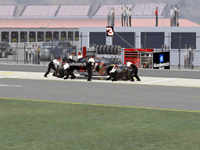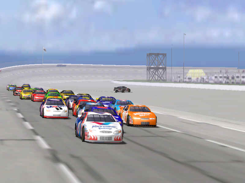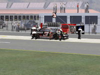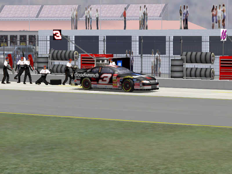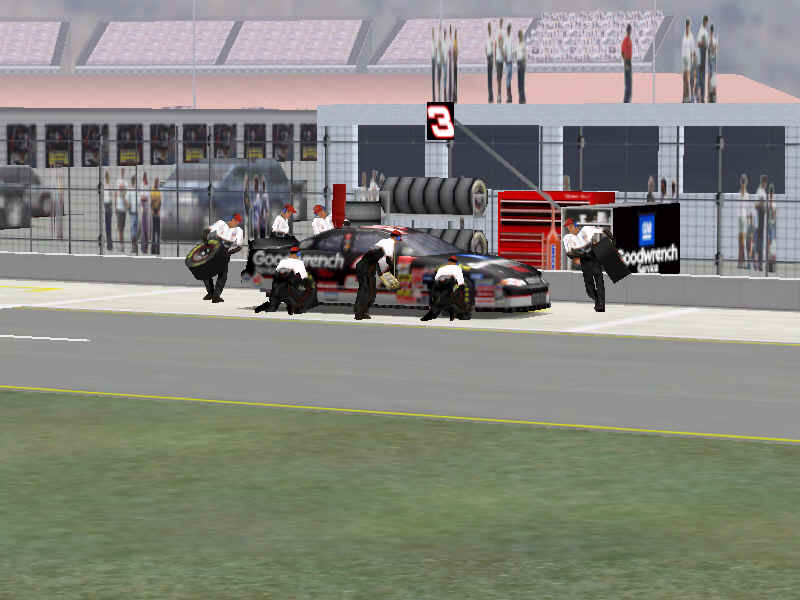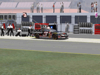 Most would like to see an animated pit crew that services your car in record time, this is included. I have put a sequence of shots below that show the pit action. You see the crew members from every angle including the in car. Guys are running around and you can head the jack and air wrenches. The one thing I noticed missing was the winshield washer. Another added bit of realism is that of roof flaps. When you spin at an increased speed you can see your roof flaps deploy to keep you on the ground. I also included a shot of this as I spun backwards through the pre-pit entrance at Tally. The final two shot is just from some very close racing at Dega. While the physics model/AI reactions are not completely finished, this seems a little more realistic than previous sims. You can gently lay your car along side of another without losing control, just to move them out of the way, but if you hit them a little to hard, chances are you will meet in the wall. The shot I included is of me making a little room down low.